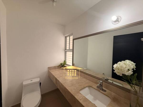 2.5 baños con canceles y espejos, y área de sala/comedor con lámparas decorativas de lujo. Lavandería Techada al Interior, Boiler